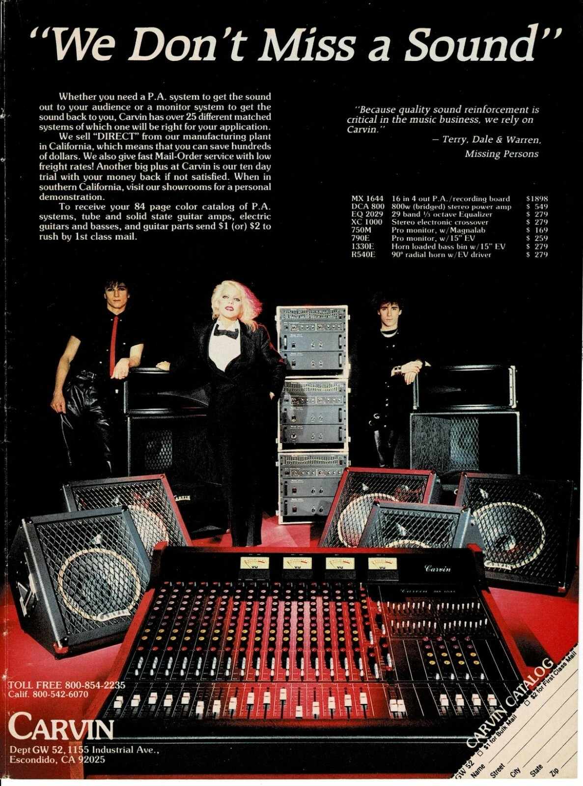Last stock! Product form CARVIN - TERRY, DALE BOZZIO & PATRICK O'HEARN OF MISSING PERSONS - 1984 Print Ad $5.95 $5.95 each CARVIN PRINT ADVERTISEMENT Size = Approximately 8 inches X 10 3/4 inches Features - Terry & Dale Bozzio and Patrick... 1 in stock Show extra info for delivery time Add to cart This item is a recurring or deferred purchase. By continuing, I agree to the cancellation policy and authorize you to charge my payment method at the prices, frequency and dates listed on this page until my order is fulfilled or I cancel, if permitted. Reviews 0 reviews Share with your friends Share WhatsApp Deel X Pin it Messenger Email Need help with your size? Size finder