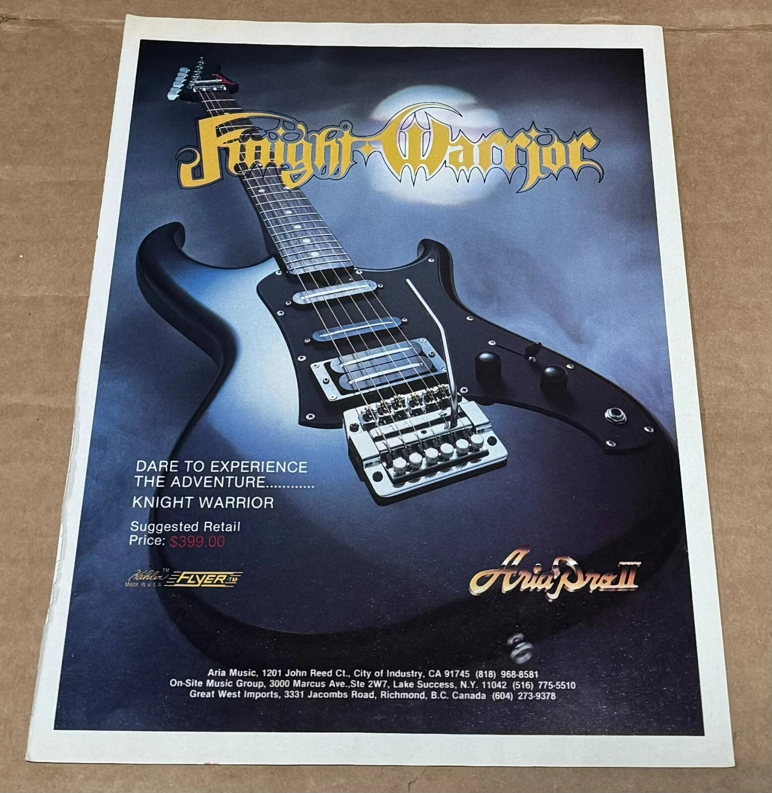 Last stock! Product form ARIA PRO II GUITARS - KNIGHT WARRIOR - 1985 Print Advertisement $5.95 $5.95 each ARIA PRO II GUITARS PRINT ADVERTISEMENT Size = Approximately 8 inches X 10 3/4 inches Features - Knight Warrior Print... 1 in stock Show extra info for delivery time Add to cart This item is a recurring or deferred purchase. By continuing, I agree to the cancellation policy and authorize you to charge my payment method at the prices, frequency and dates listed on this page until my order is fulfilled or I cancel, if permitted. Reviews 0 reviews Share with your friends Share WhatsApp Deel X Pin it Messenger Email Need help with your size? Size finder